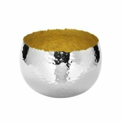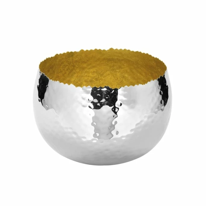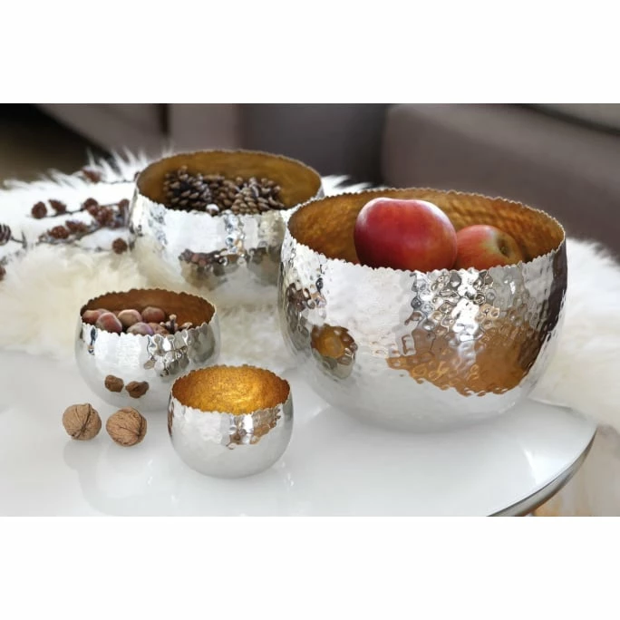 Mit dieser kostbaren Schale SEFA aus der exklusiven Fink Living-Kollektion verwandeln Sie Ihr Zuhause in eine glamouröse Luxus-Oase. Aus hochwertig vernickeltem Eisen mit einer kunstvoll gehämmerten Struktur gefertigt, beeindruckt das Exemplar durch eine strahlende Aura, der sich niemand entziehen kann. Besonders edel: Die Schale wurde auf der Innenseite aufwendig mit kostbarer Metallfolie verkleidet und besitzt einen zackenförmigen Rand, der ebenfalls in aufwendiger Handarbeit in ausgewählten Manufakturen entsteht. Wählen Sie zwischen unterschiedlichen Größen und Farben, die Ihnen das perfekte Wohnaccessoire für die stilvolle Tafel, den edlen Wohnzimmertisch oder die hübsche Kommode schenkt. Bestellen Sie die raffinierte Schale SEFA aus dem Hause Fink in einer von vielen Varianten und genießen Sie das moderne Design!