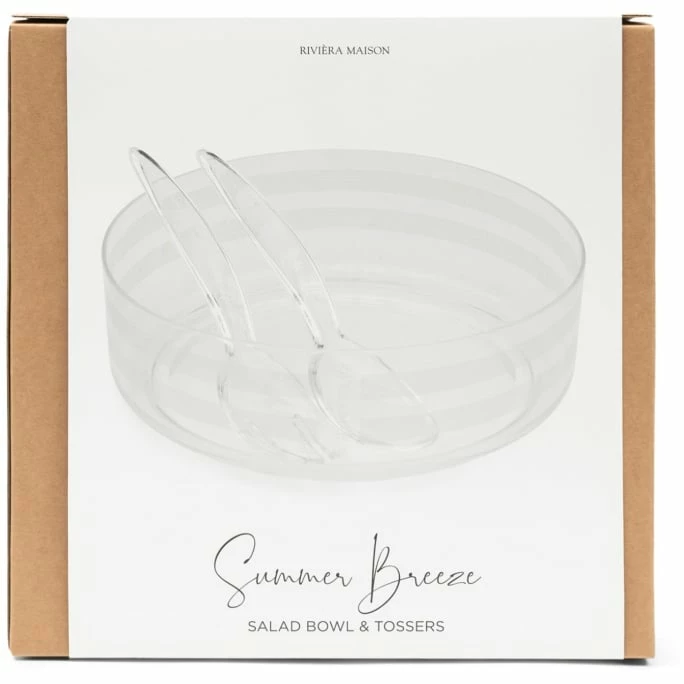 Salatliebhaber aufgepasst: Genießen Sie Ihren Lieblingssalat ab sofort besonders stilvoll in der Summer Breeze Salatschüssel mit Salatbesteck von Rivièra Maison. Aus transparentem Kunststoff gefertigt, ist Summer Breeze mit einem feinen Streifendekor verziert und kann zur Reinigung problemlos in die Spülmaschine gegeben werden. In der Rivièra Maison Schale passt wunderbar ein großer Salat zum Mitnehmen in den Park, an den Strand oder zum Mittagessen im eigenen Garten. Kennen Sie jemanden, der gerne picknickt? Dann ist die Summer Breeze Salatschüssel mit Salatbesteck das perfekte Geschenk für den Sommer, denn das stylische Rivièra Maison Set wird in einer hübschen Geschenkverpackung verpackt geliefert. Lassen Sie sich von dem tollen und praktischen Design begeistern und servieren Ihre frischen und knackigen Salate in der Summer Breeze Salatschüssel mit Salatbesteck von Rivièra Maison!
