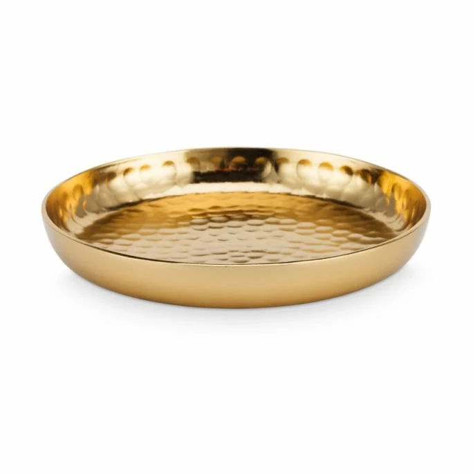 Edel, zeitlos und besonders raffiniert im Design! Die wunderschönen Metallteller Metal Plate aus dem Haus VTwonen sind einfach ein echter Hingucker! Aus robustem Metall gefertigt ist jeder Teller in einem edlen Goldlook gehalten und innen mit einem tollen Hammerschlagdesign versehen. Der 1,5 cm hohe Rand und die glatte Außenfläche runden das Gesamtbild dabei perfekt ab. Mit einem Durchmesser von 12 cm eignet sich der kleine Metal Plate Teller hervorragend als Untersetzer oder mit einer Kerze bestückt als exquisite Tischdekoration. Ein absolutes Must-have für alle Liebhaber von zeitlos-hochwertigem Design. Hier im Shop bietet AMBIENDO Ihnen den VTwonen Metal Plate Teller in drei verschiedenen Größenvarianten an. Kombinieren Sie alle drei Größen und zaubern eine erlesene und geschmackvolle Dekoration auf Ihrem Esstisch oder Ihrer Anrichte. Bestellen Sie jetzt, Sie werden begeistert sein!